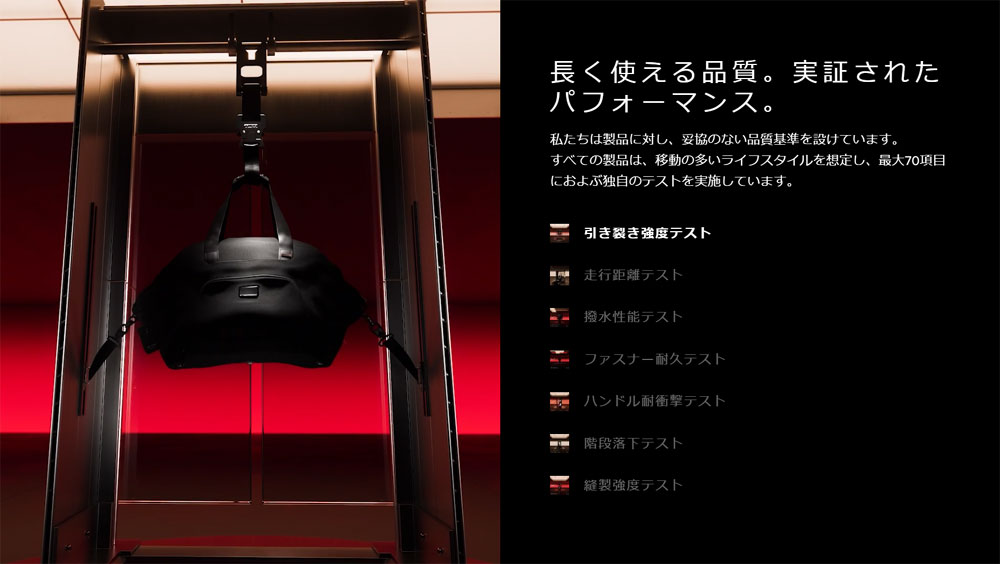 ビジネスバッグに求められる基本的なパフォーマンスを維持しながら、長く使える品質を実証するために、すべての製品について、移動の多い、より厳しいライフスタイルを想定し、