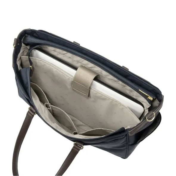 大きめのファスナーポケットには、ペンや名刺入れなど小物、ビジネスアイテムを整理して収納できるオーガナイザーポケットを備えています。