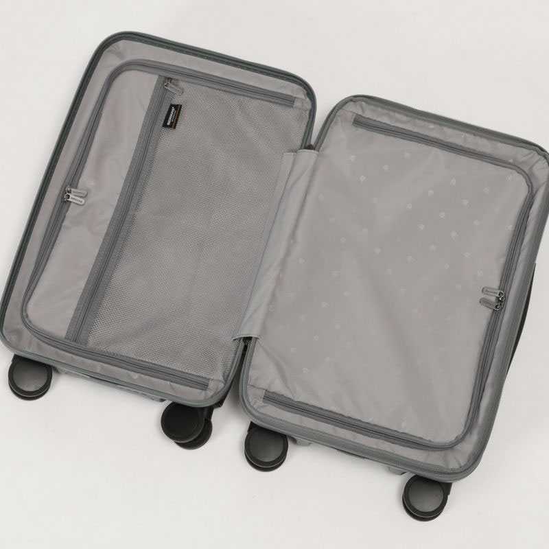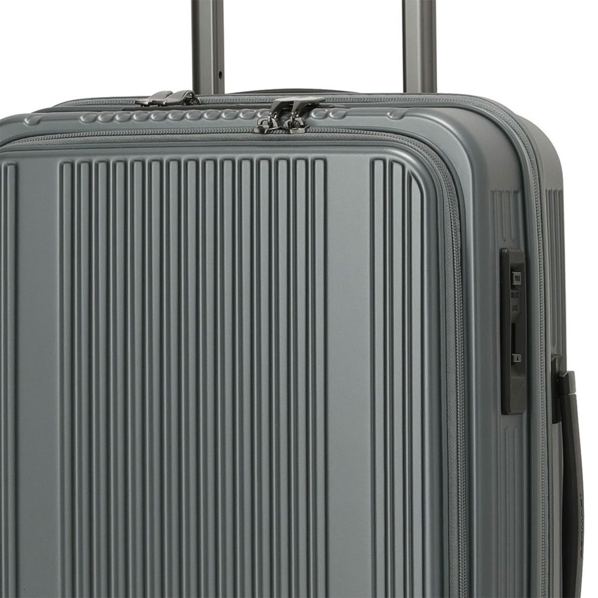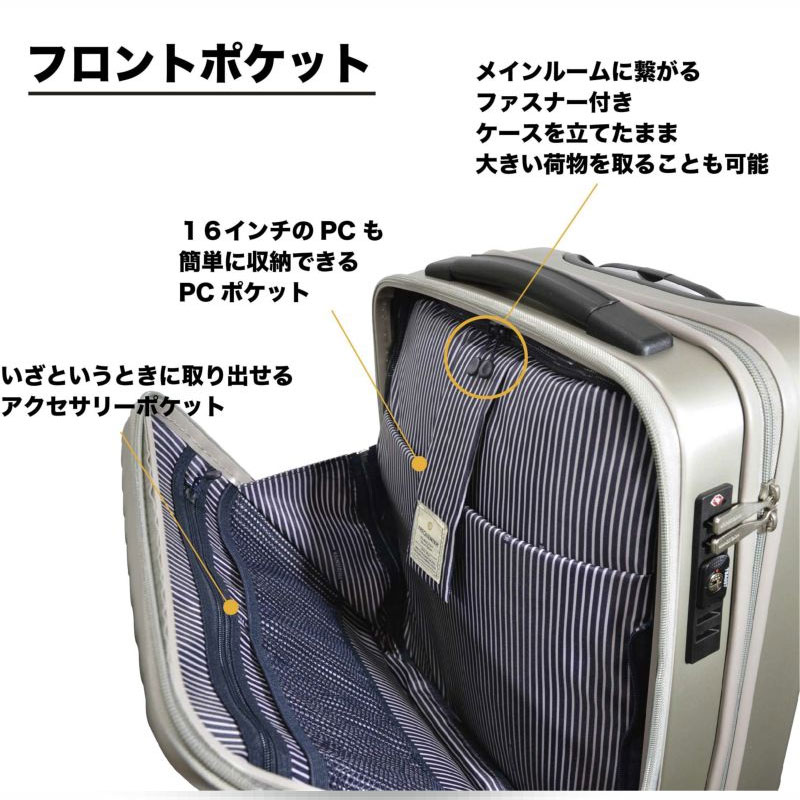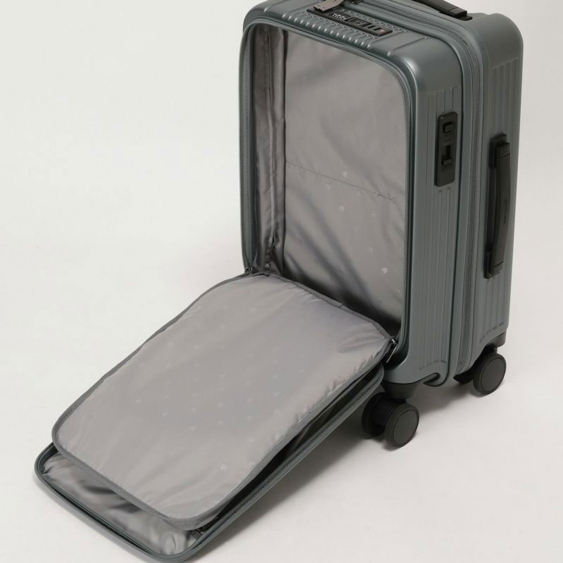 キャリーケースを寝かさずに立てたまま、開いて荷物の出し入れが可能、移動中に出し入れする荷物の収納便利なフロントオープンポケットを備えています。
