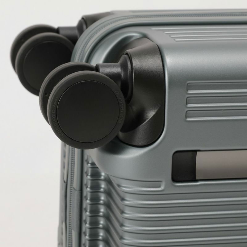 キャスターには、高品質で数多くのスーツケースブランドに採用されて高い耐久性が評価されているHINOMOTO製のストッパー付き静音キャスター「Lisof®」を搭載。ダブルホイールタイプの大口径60㎜キャスターは、静音性を追求しながらも安定した高い走行性能を発揮します。