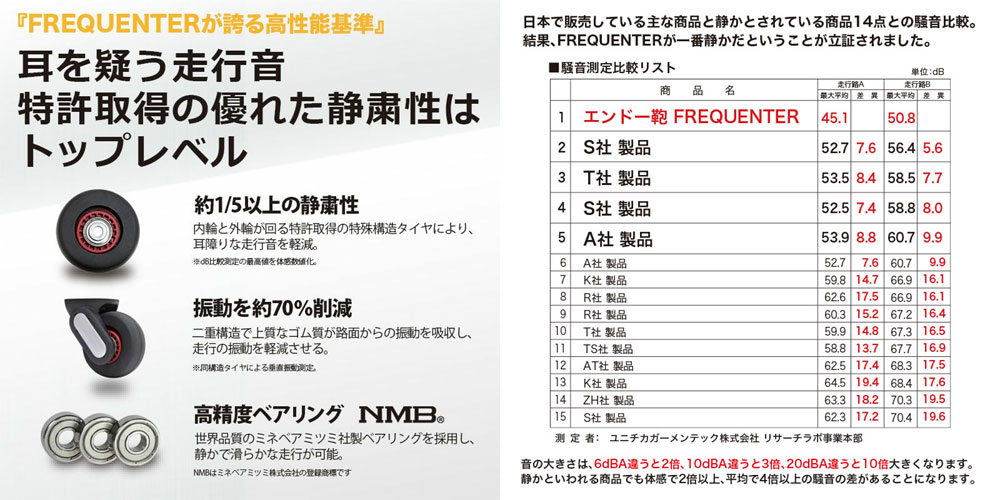 フリクエンターのキャリーケースの最も大きな特長は、特許取得している特殊な構造のキャスター車輪によって実現した抜群の静音性です。