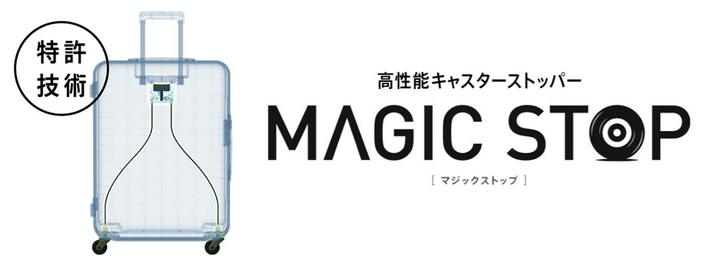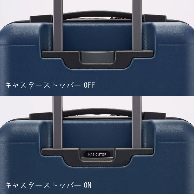 ボタンを押すとMAGIC STOP機構が作動して、ワイヤーを伝って両方のキャスターに均等に力が加わり、片効きを防いでスーツケースをしっかりと固定します。