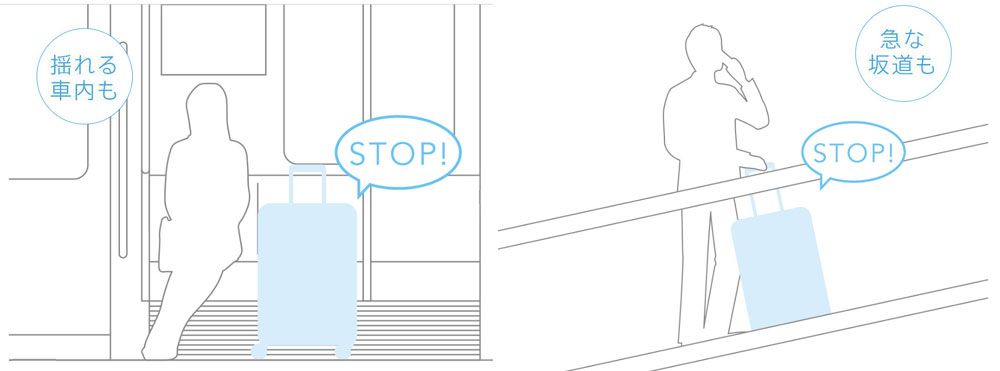 キャスターストッパー®・・・揺れる電車の中や傾斜のある場所など、車輪を手元のボタン1つで固定できる、独自開発・特許取得の機能